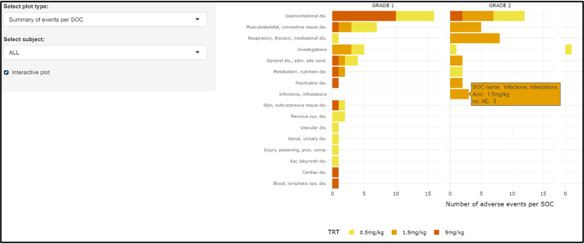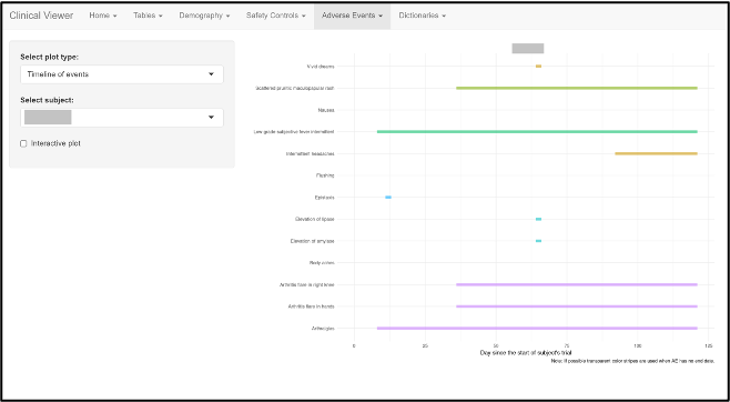 Clinical Viewer as an interactive application visualizes the data retrieved during the clinical trial. It downloads study data from different platforms: EDC, ePRO, CTMS, wearable data or other databases which can then be analyzed using a bespoke project website. Clinical Viewer may present graphs and tables summarizing various clinical trial parameters, including recruitment, safety signals, efficacy, and endless other parameters.